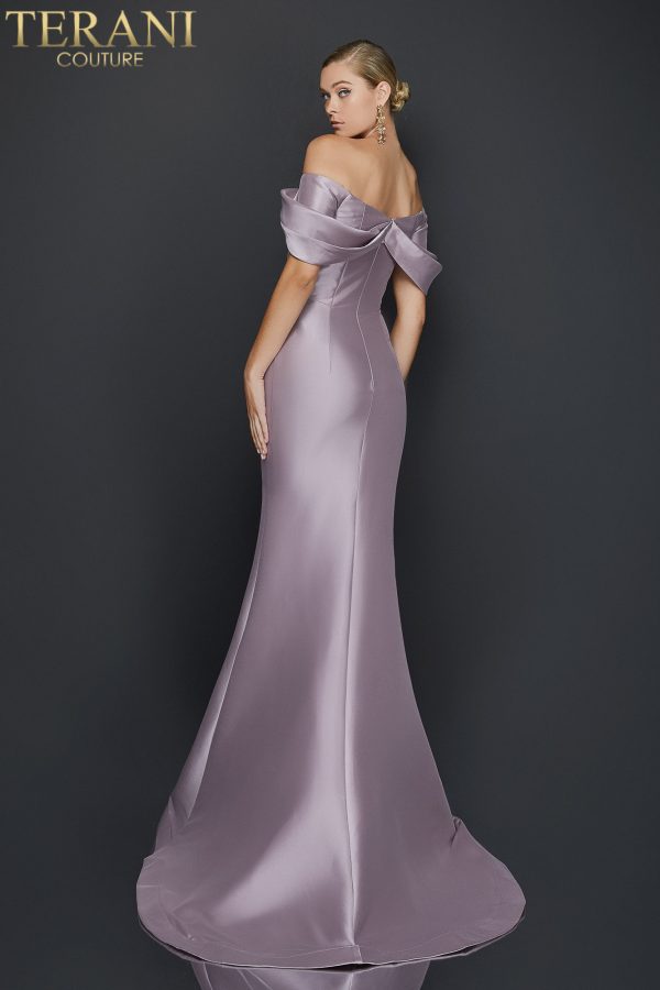 Eye catching off shoulder collar drapes over a plain stretch evening Mikado gown with tail.