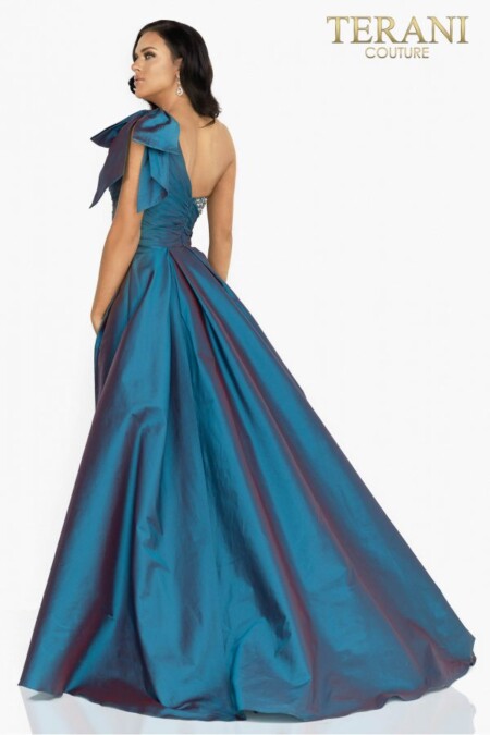 فستان سهرة طويل مميز من تصميم تيراني كوتور ، يأتي بكتف واحد في التفتا مع زينة باللؤلؤ والبلورات البيضاء على كامل الفستان وجرار اضافي للتنورة من الجانبين لتبدو اطلالتك اكثر فخامة