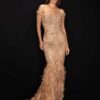 فستان سهرة مكسي في غاية الجمال ، مرصع بالخرز الثقيل من تصميم تيراني كوتور ، ويتميز هذا الفستان المطرز بتنورة مزينة بحافة ريش بلونين تزيد من جمال اطلالتك