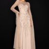 فستان سهرة في غاية الشياكة والأناقة من تصميم تيراني كوتور ، يأتي بقصة ضيقة على الجسم وأكمام طويلة بوق شفافة مزخرفة بالخرز مع ياقة مرتفعة