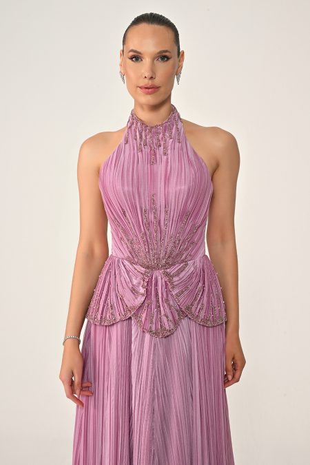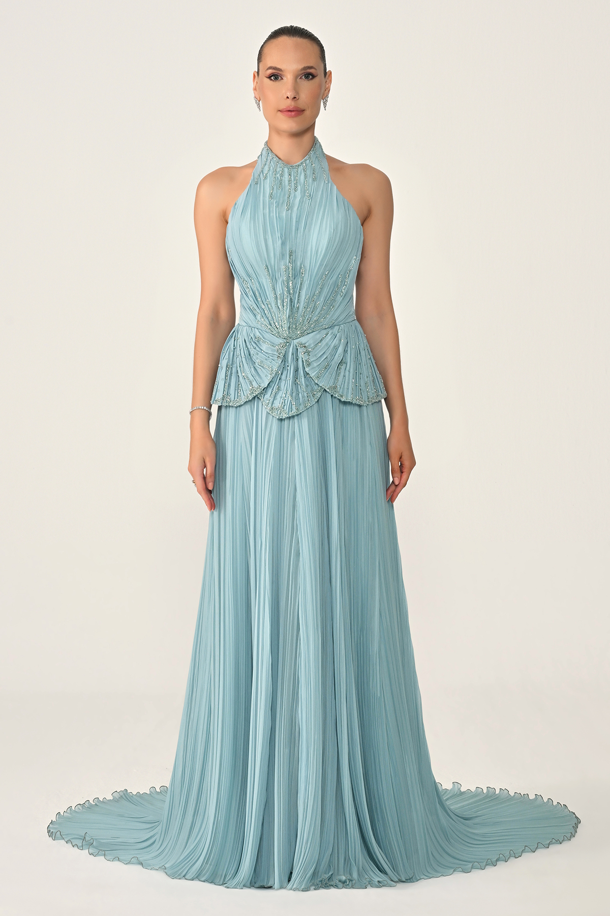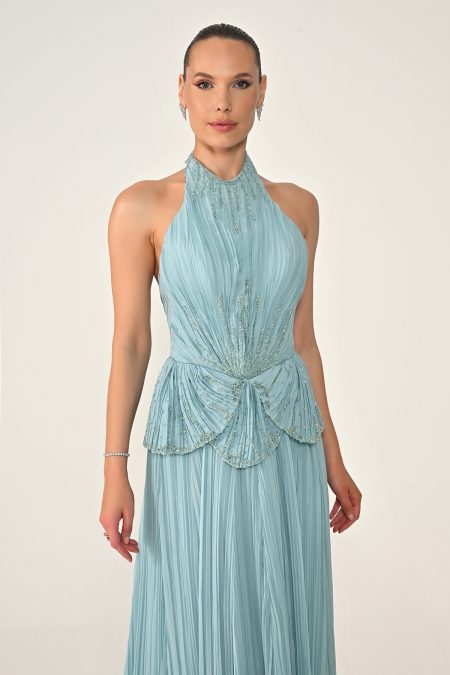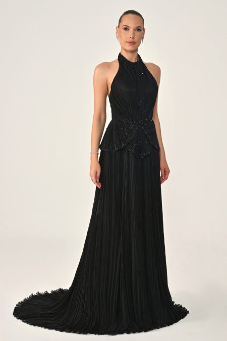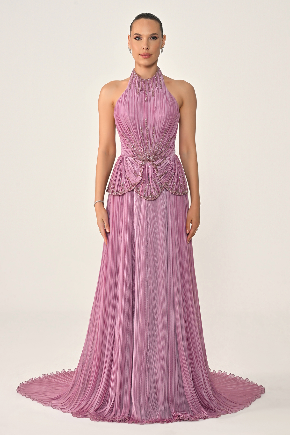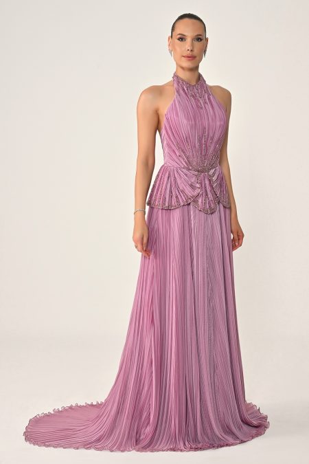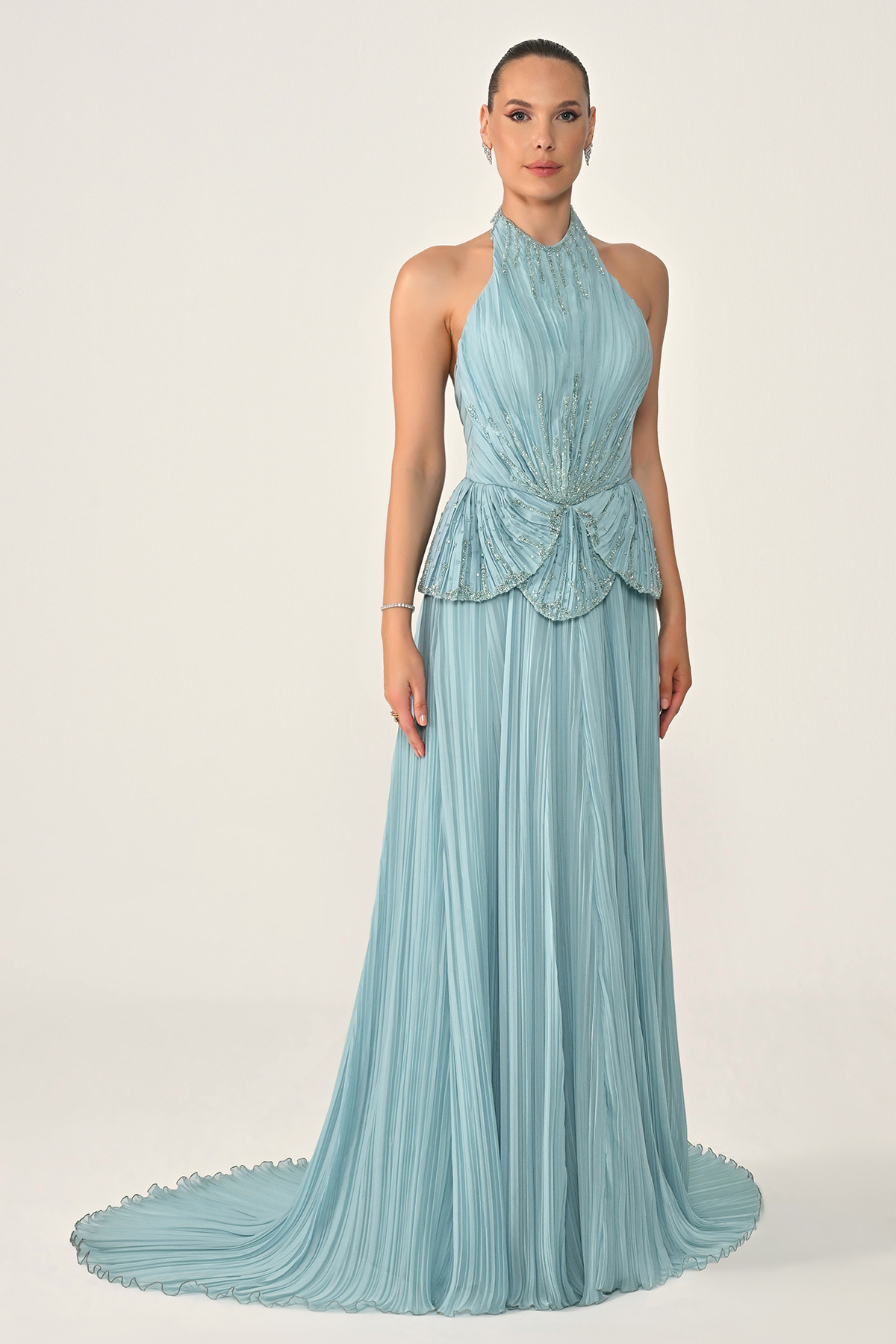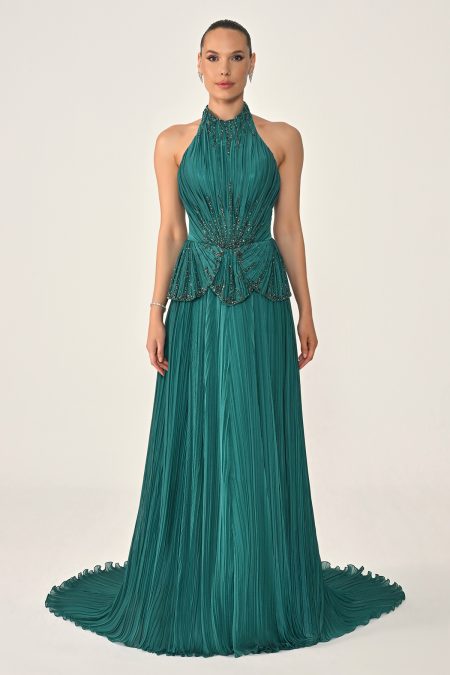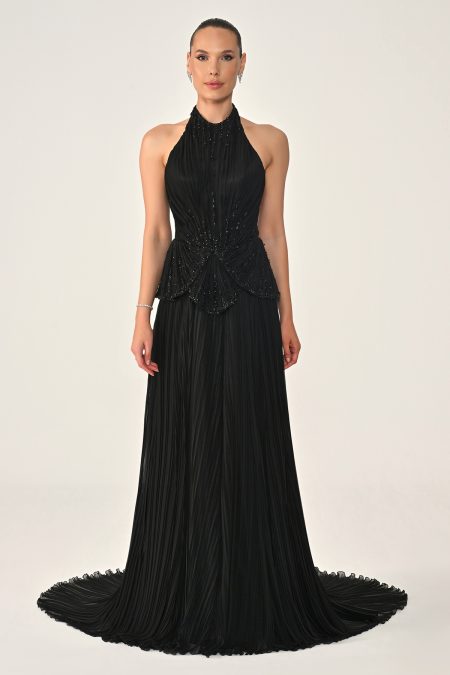 فستان سهرة طويل بقصّة عنق عالية، مطرّز بتفاصيل ناعمة عند الصدر والخصر مع تنورة واسعة بانسيابية ولمسة ذيل خفيفة تعطيه فخامة وأناقة.