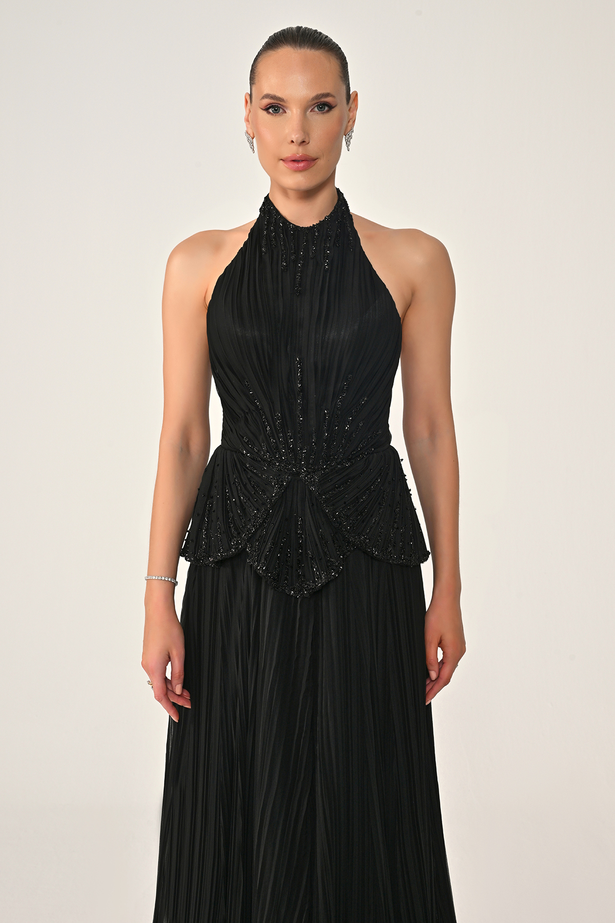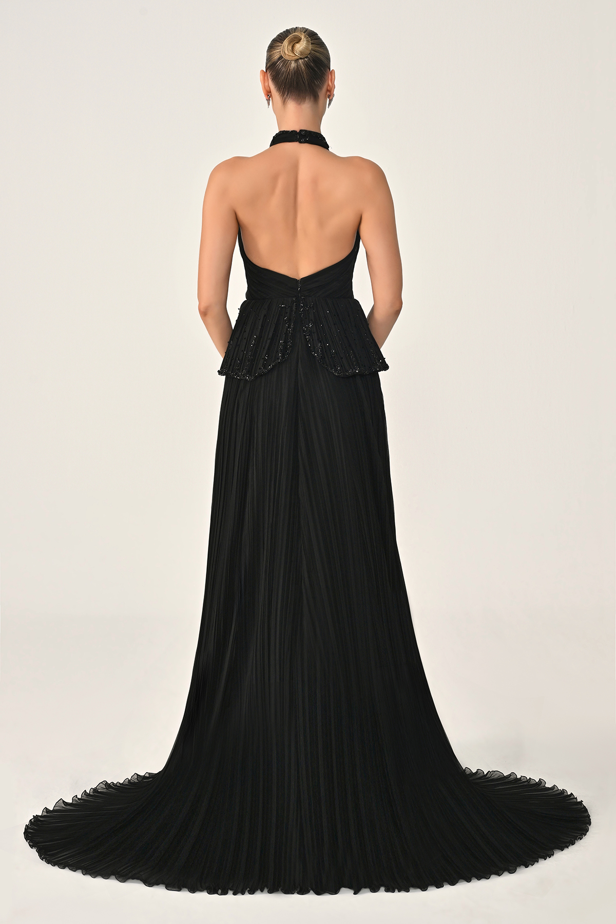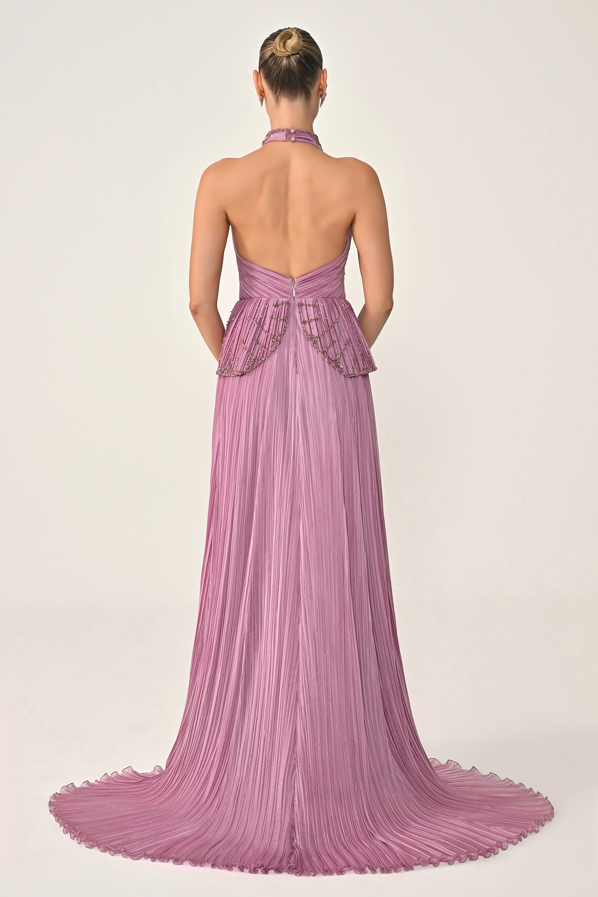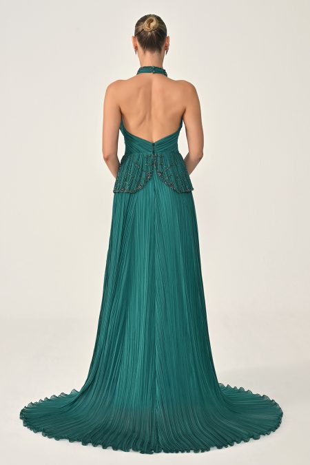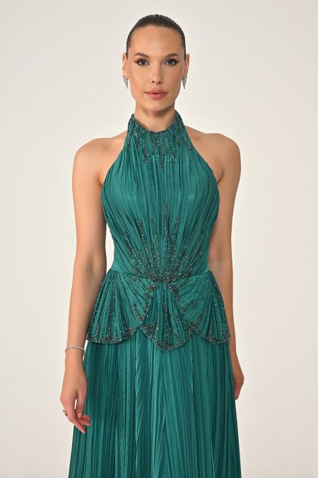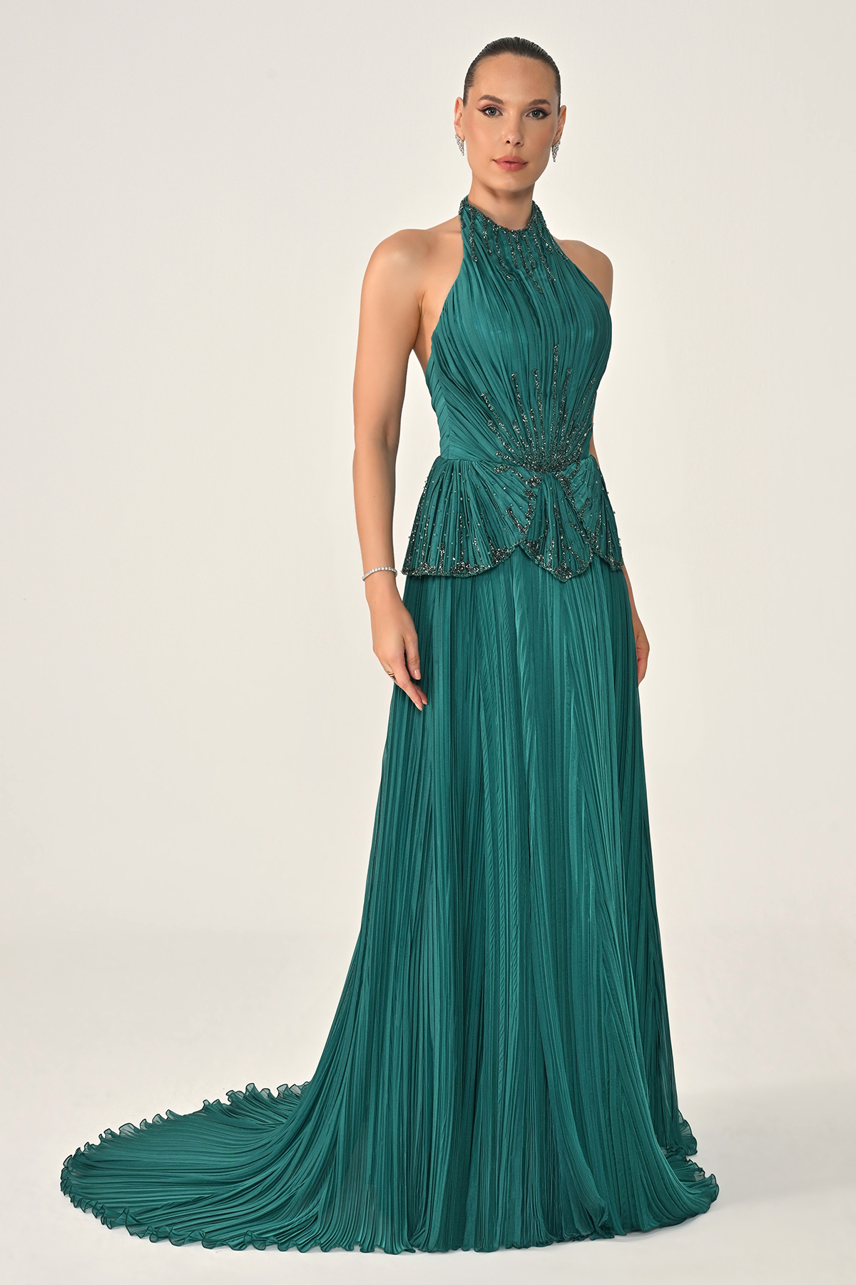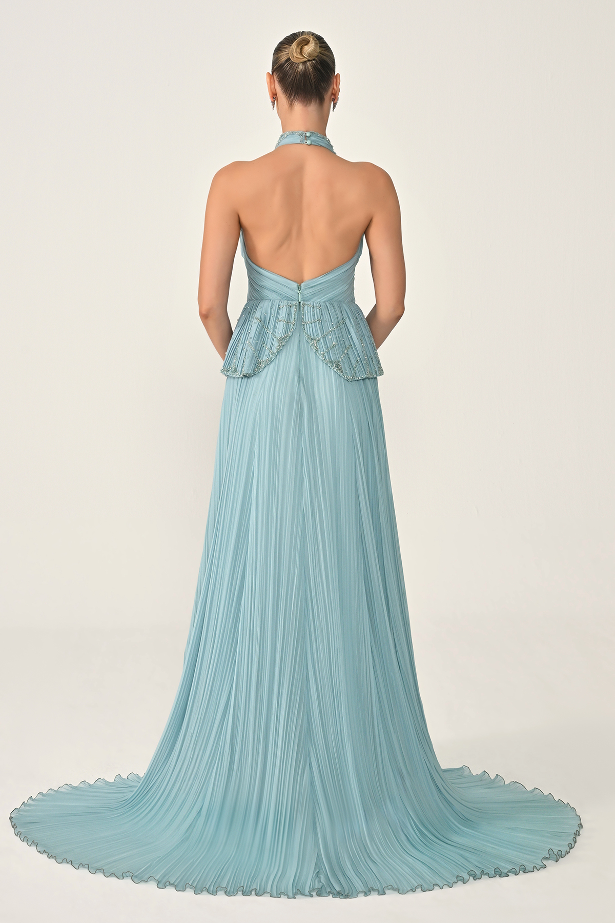 فستان سهرة طويل بقصّة عنق عالية، مطرّز بتفاصيل ناعمة عند الصدر والخصر مع تنورة واسعة بانسيابية ولمسة ذيل خفيفة تعطيه فخامة وأناقة.
