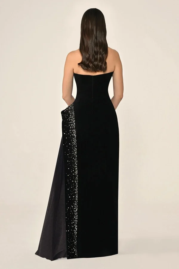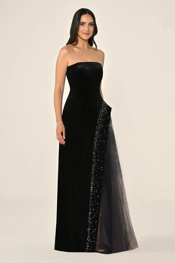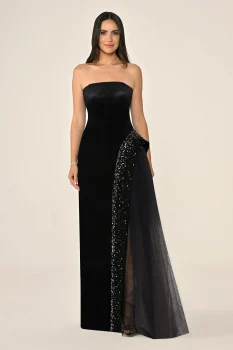 فستان باصدار جديد من المخمل بقصة صدر توب وفتحة علي الجنب مشغولة باطرافها من كولكشن الفا بيتا الجديد