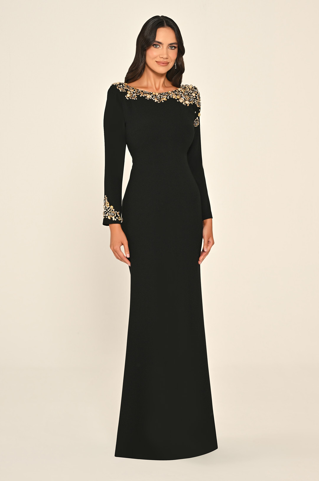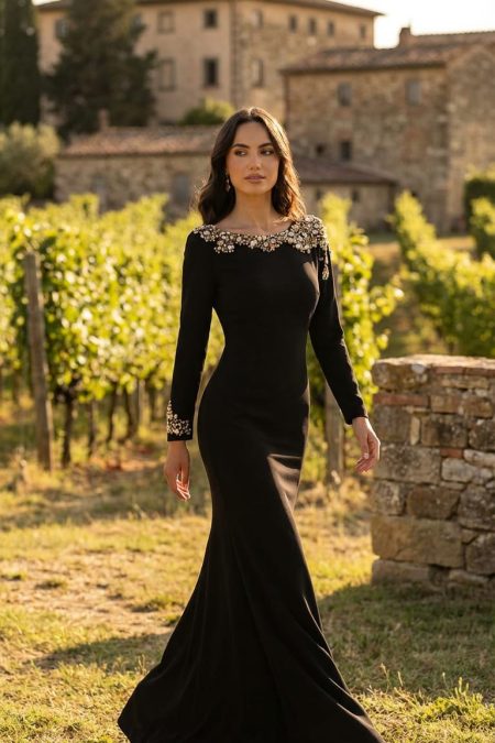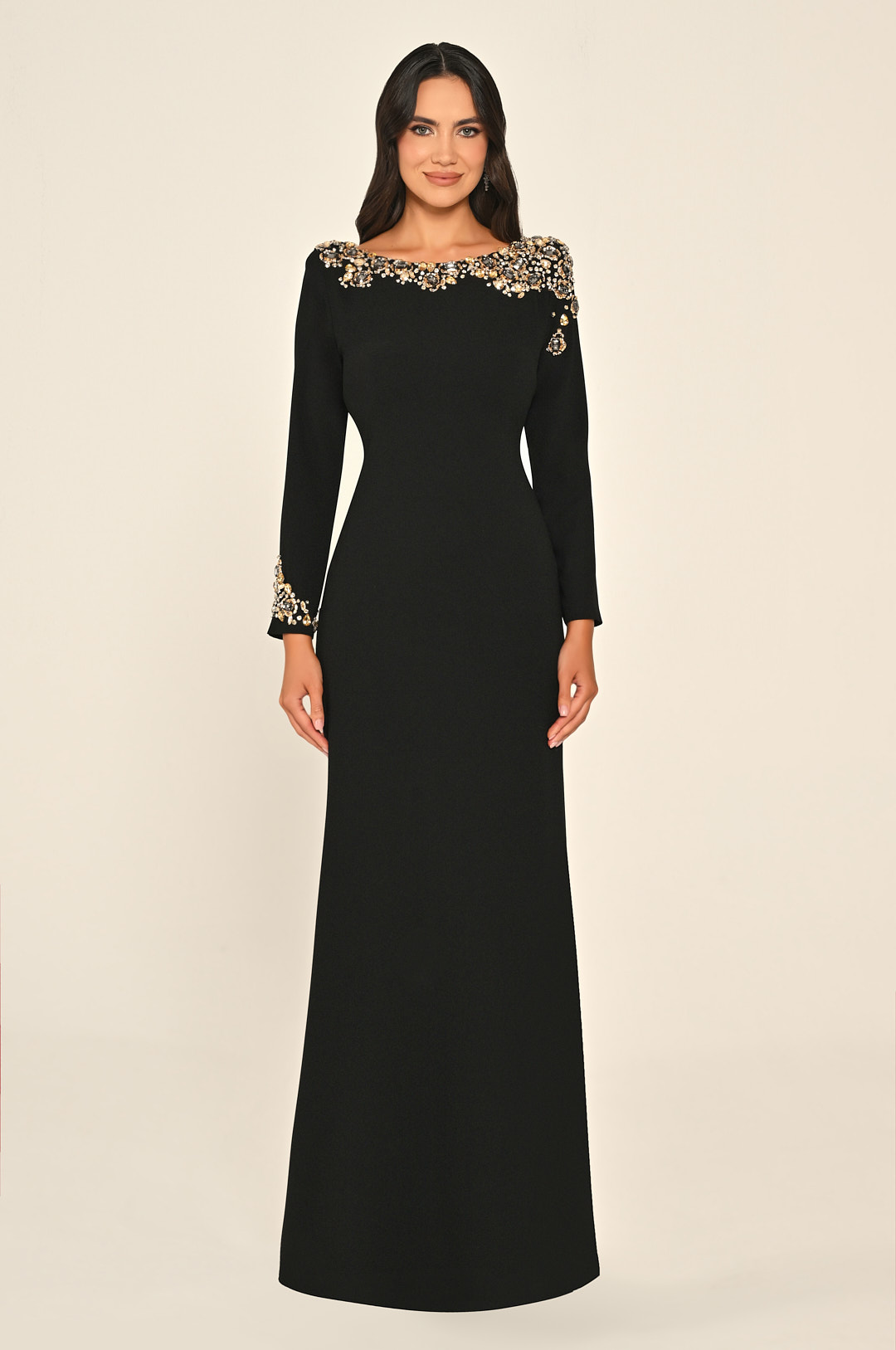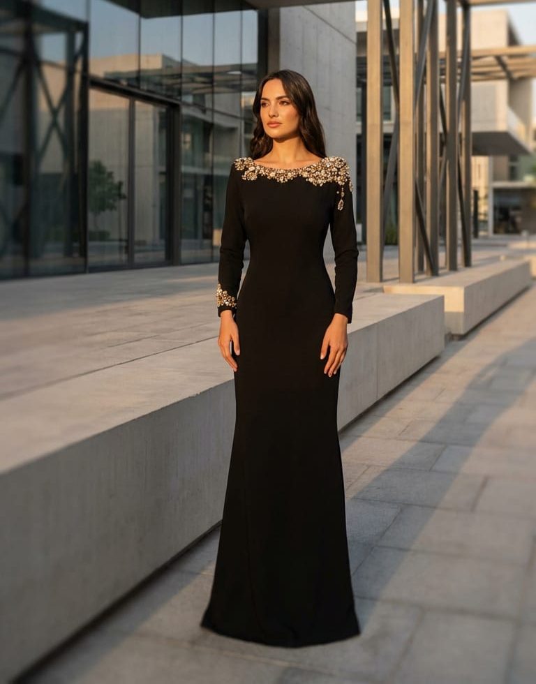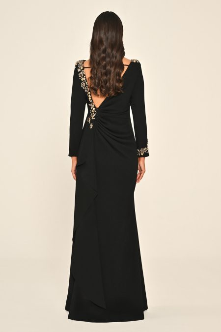 فستان باكمام طويلة مشغول بالاحجار والكرستال في الجهة العلوية بفتحة ضهر مصنوع من الكريب