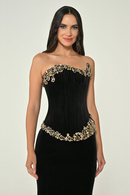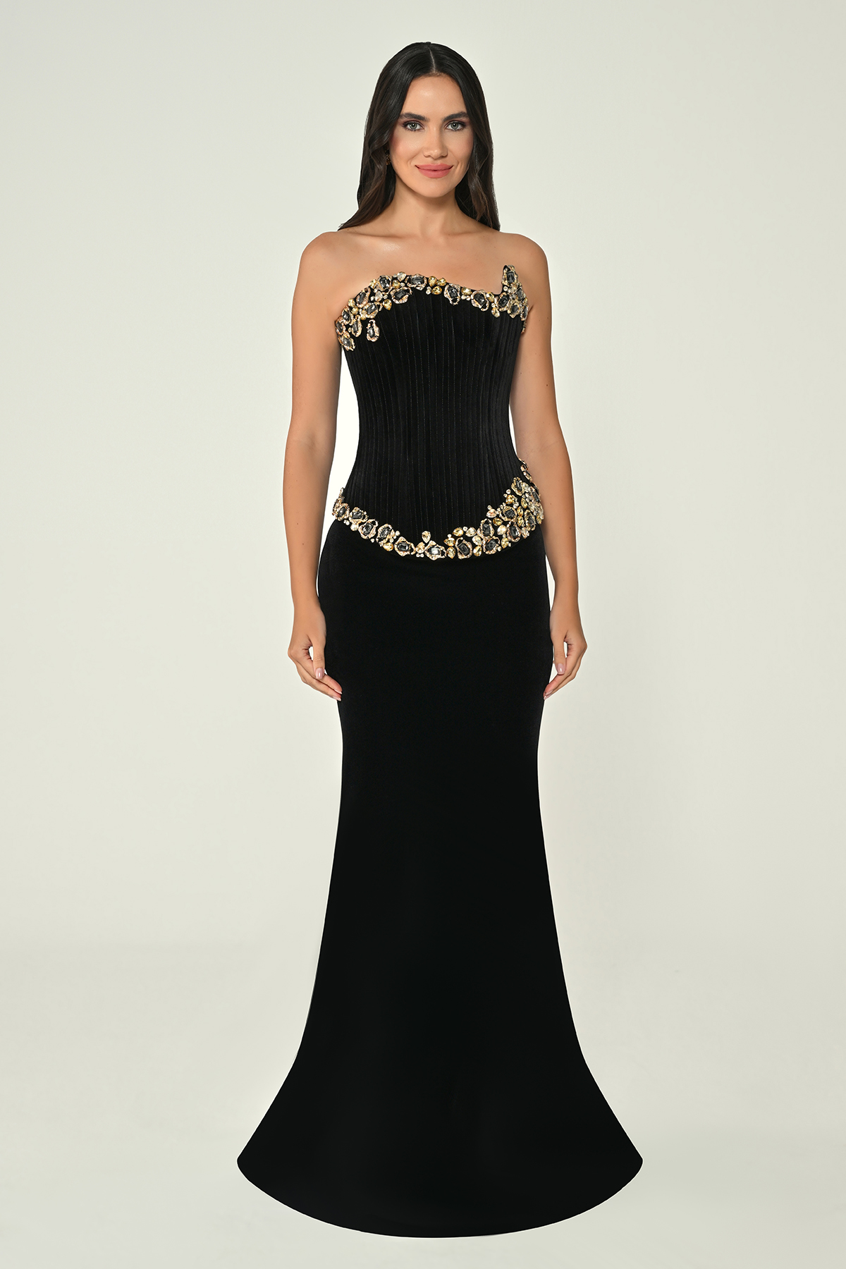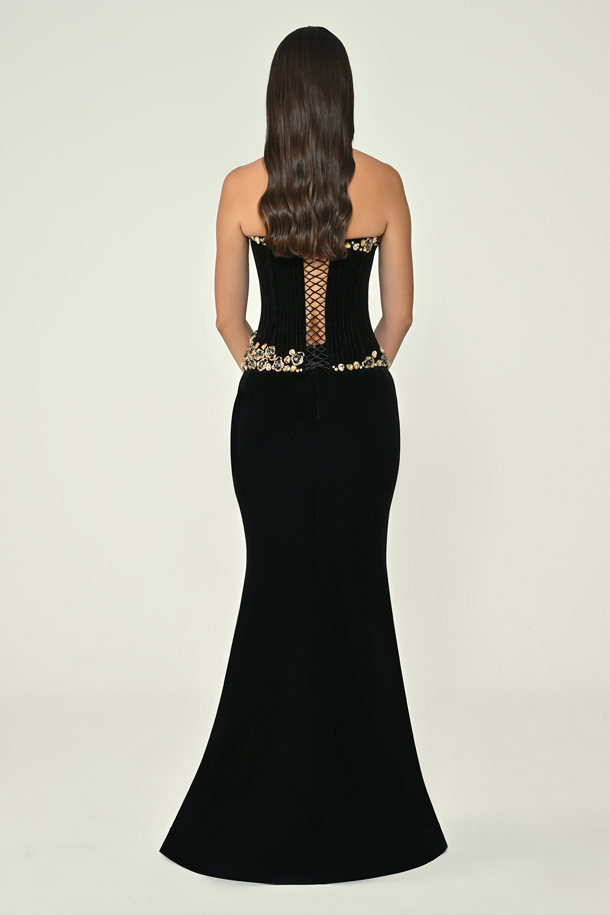 فستان فاخر من المخمل الايطالي الراقي مشغول بالاحجار والكرستال بقصة صدر راقية وباحبال من الخلف