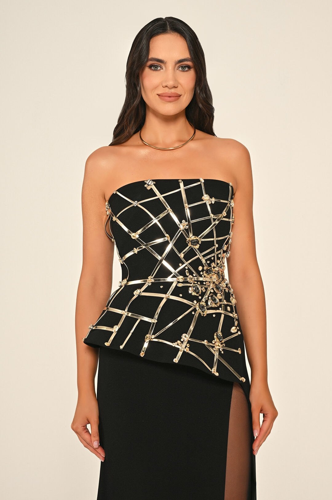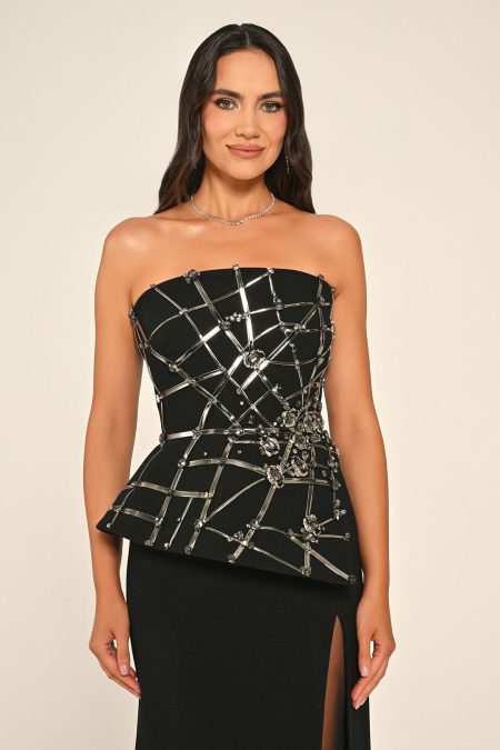 فستان مشغول من الصدر بفتحة ساق مبطنة بتل نصف شفاف