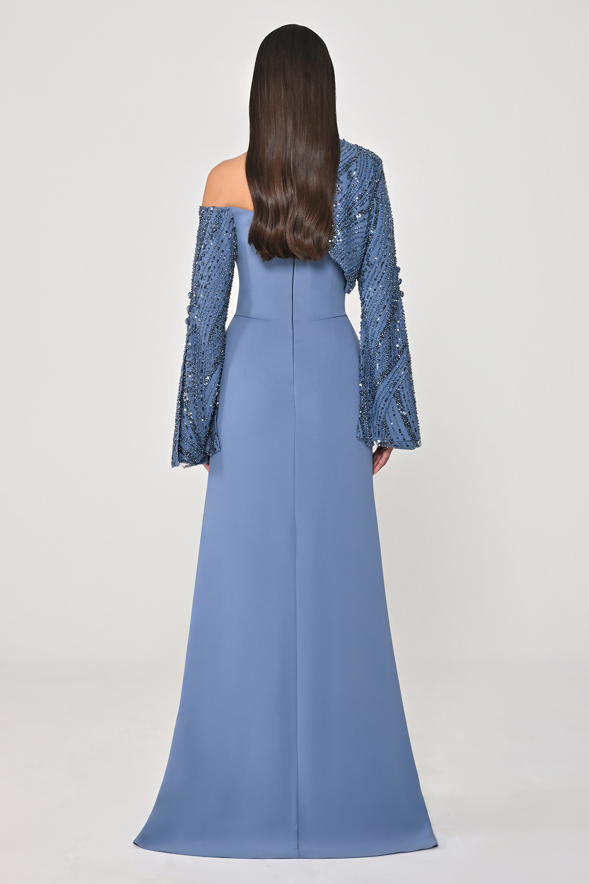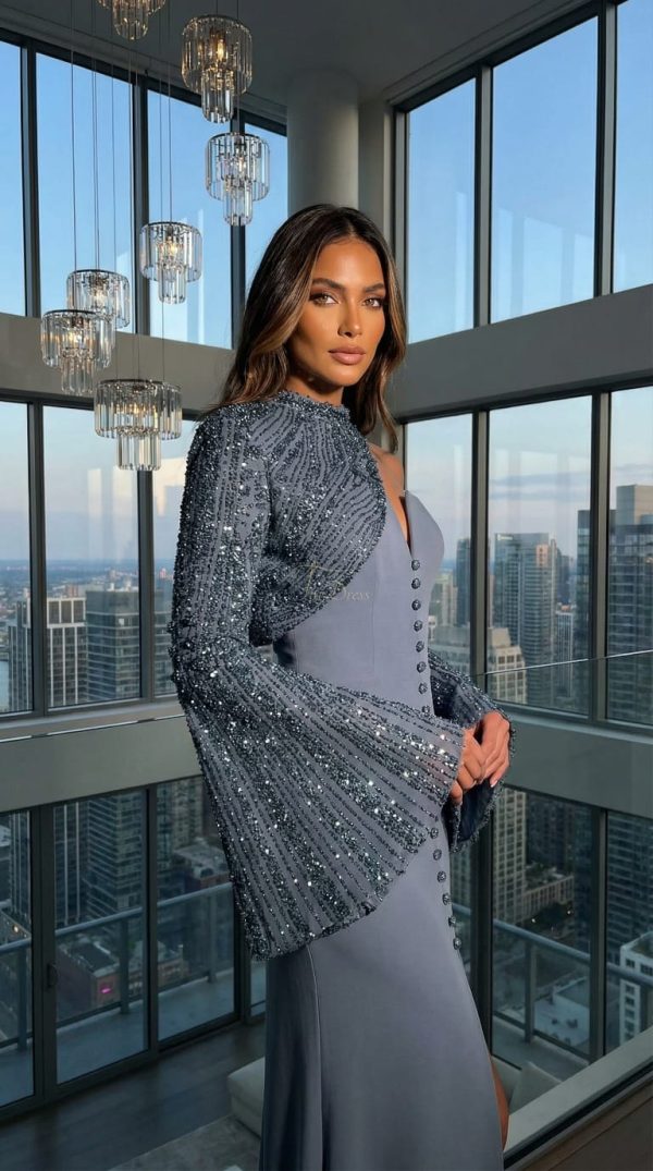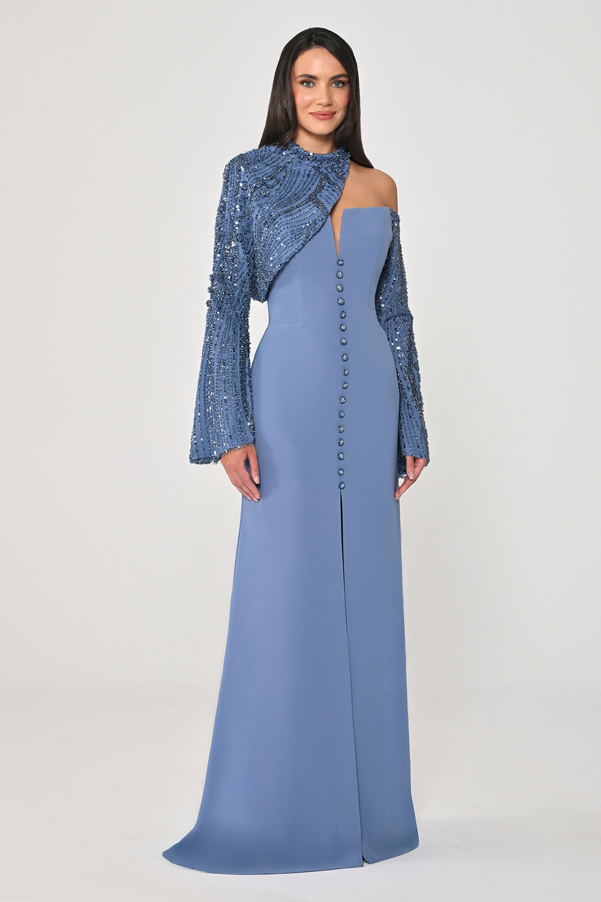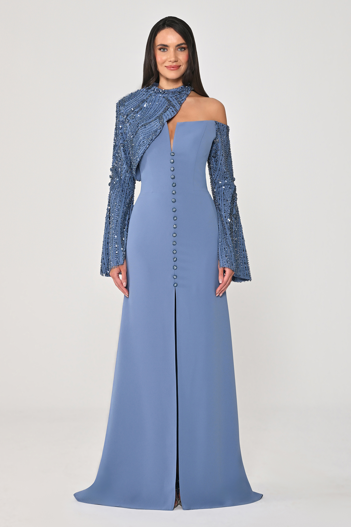 فستان الفا بيتا قطعتين باكمام مفتوحة وازرار في الوسط من خامة الكريب
