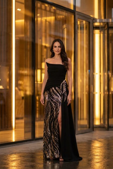 فستان الفا بيتا من الكولكشن الجديد بقطعة سفلية مشغولة وقطعة علوية سادة فتحة ساق جانبية