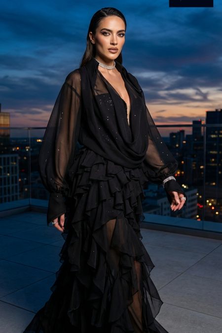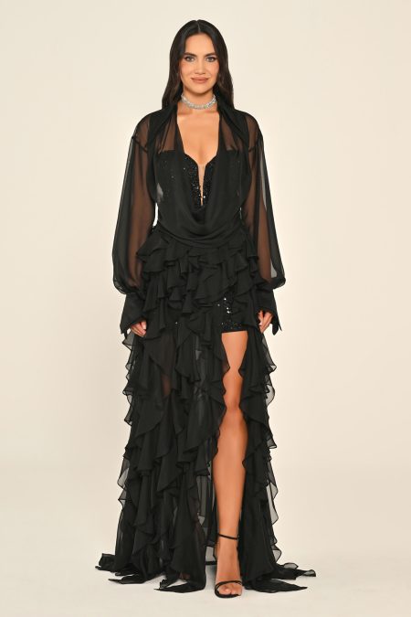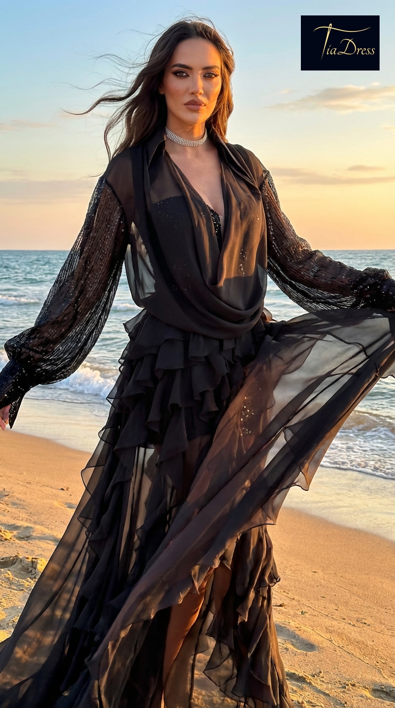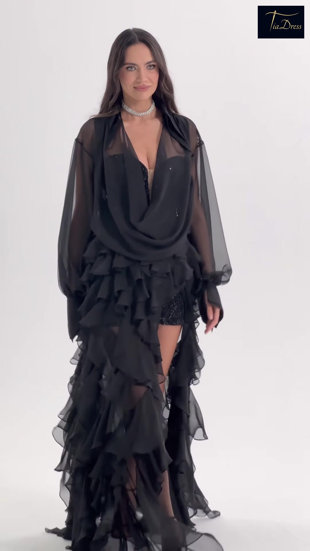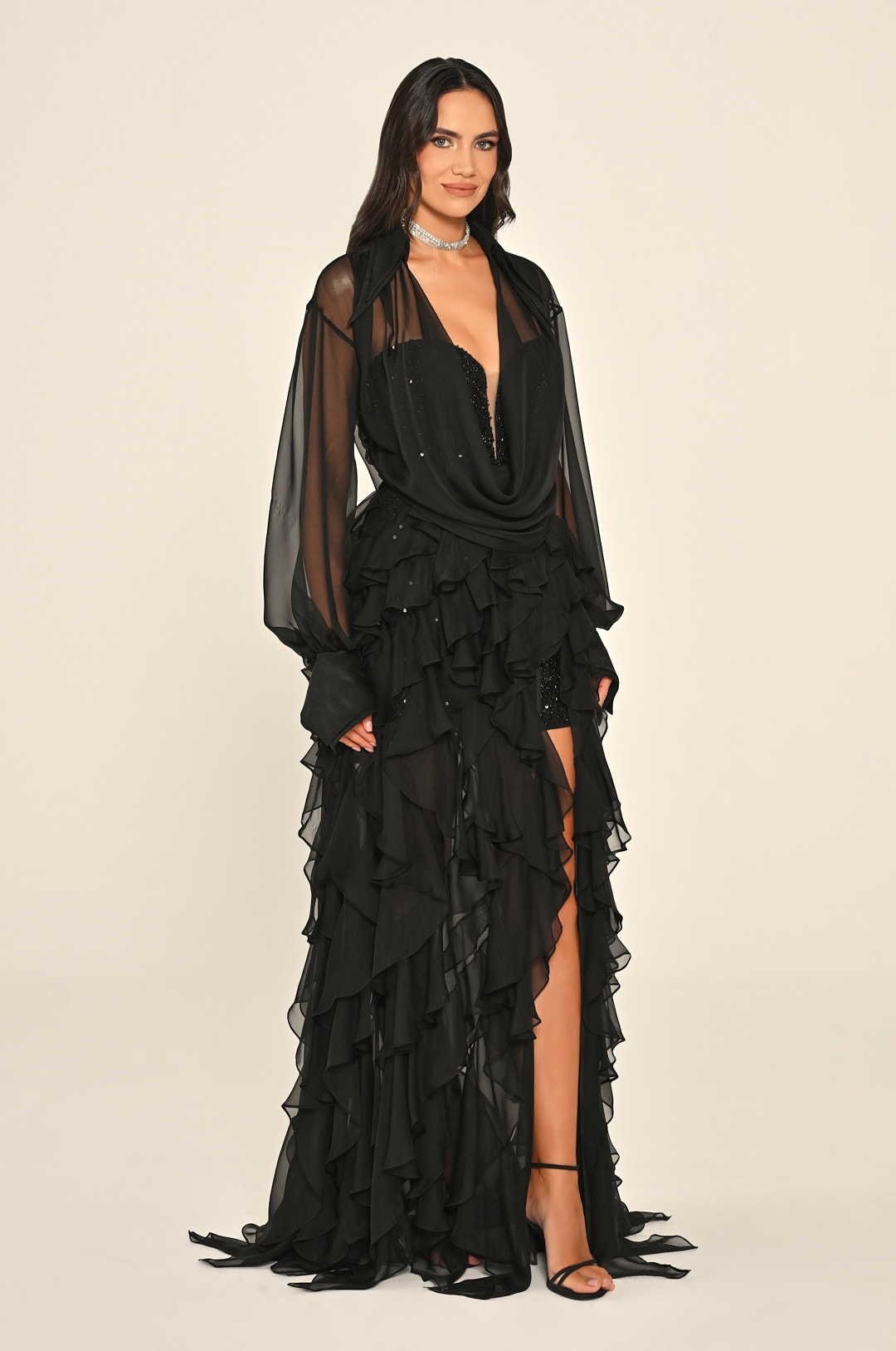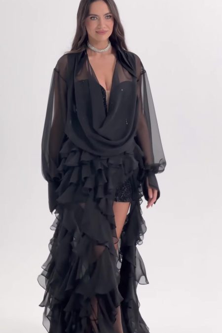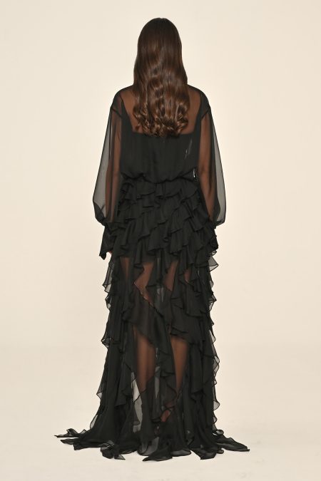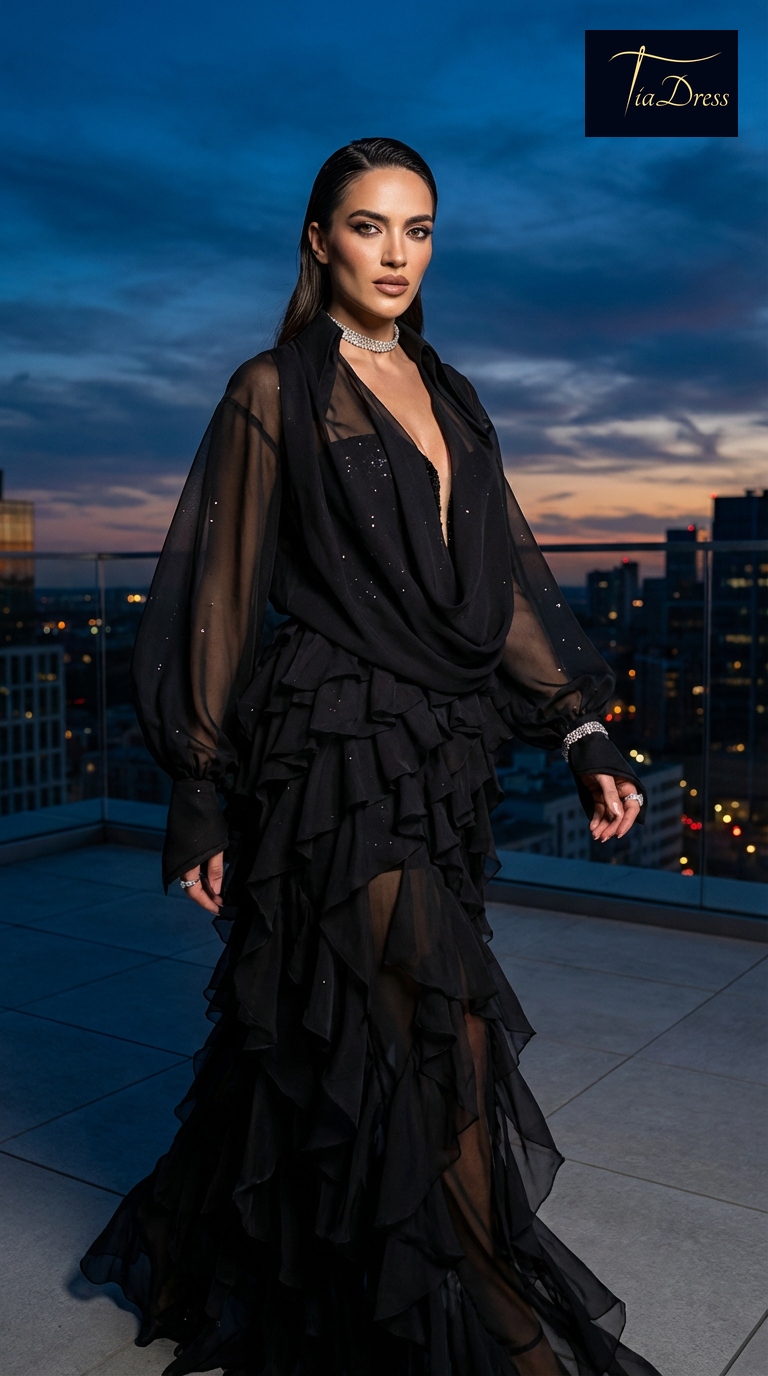 فستان من التل والدانتيل بطبقات باللون الاسود