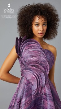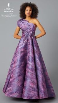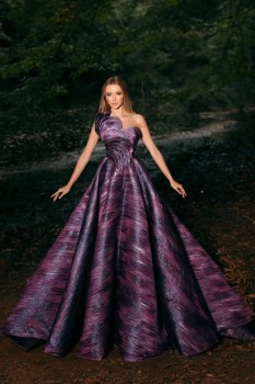 فستان سهرة بنفسجي اللون حيث اللمعة والفخامة تبهر الناظرين من تصميم اون كوتور ، يعكس فخامة الخياطة الراقية بين القصّة الملكية ولونه النحاسي المعدني الرهيب متوفر بجميع المقاسات لدى تيا دريس