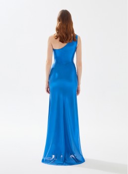 فستان ستان طويل كتف واحد يعرض بشكل حصري علي تيا دريس من فساتين طارق ايديز 2023