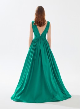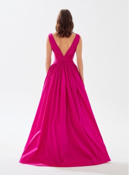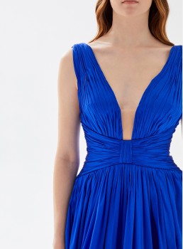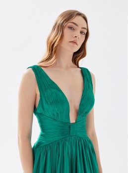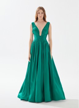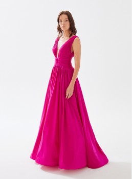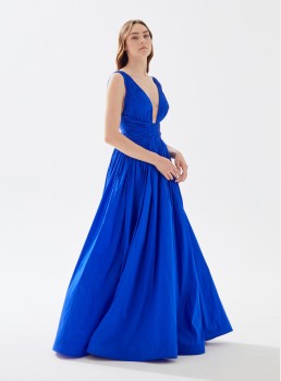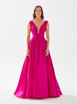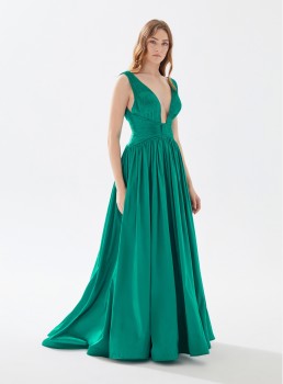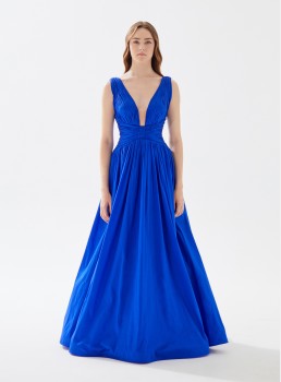 فستان طويل كلوش بفتحة صدر يعرض بشكل حصري علي تيا دريس من فساتين طارق ايديز 2023