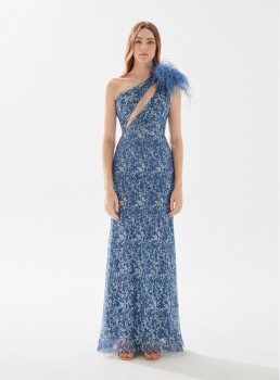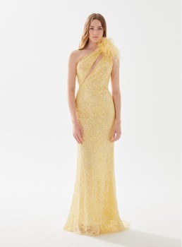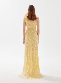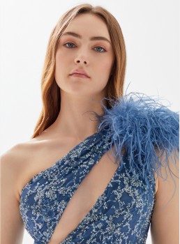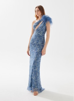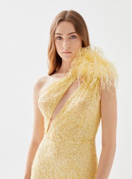 فستان مزين بالترتر بكتف واحد من الريش يعرض بشكل حصري علي تيا دريس من فساتين طارق ايديز 2023