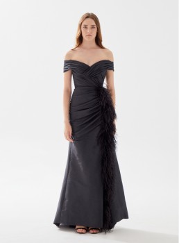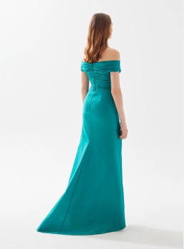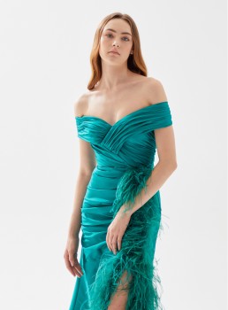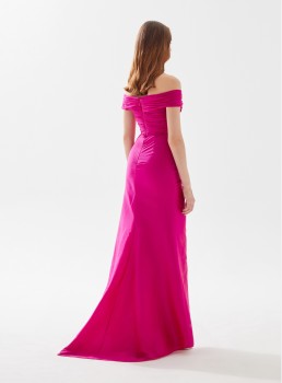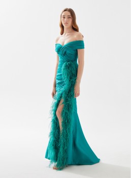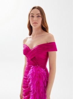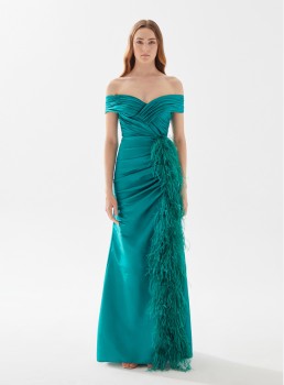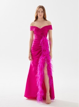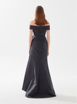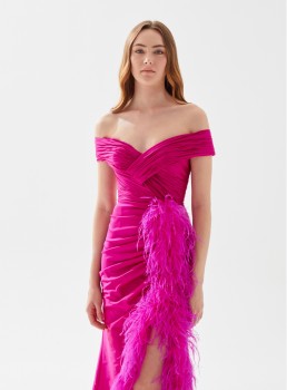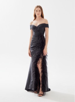 فستان مكشوف الأكتاف مع فتحة ساق بريش جانبي يعرض بشكل حصري علي تيا دريس من فساتين طارق ايديز 2023