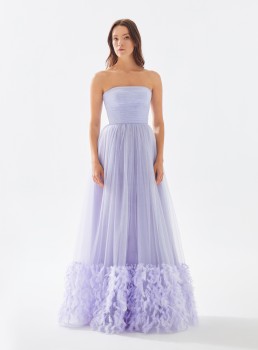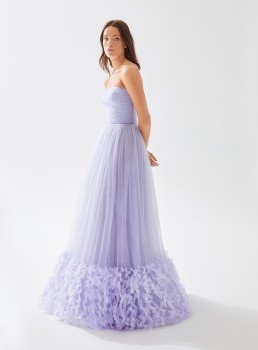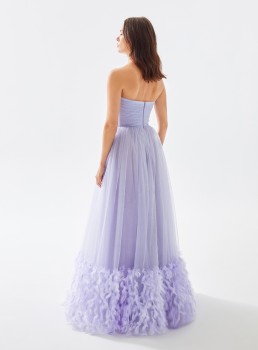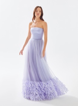 فستان تول بدون حمالات مع حاشية من الريش يعرض بشكل حصري علي تيا دريس من فساتين طارق ايديز 2023