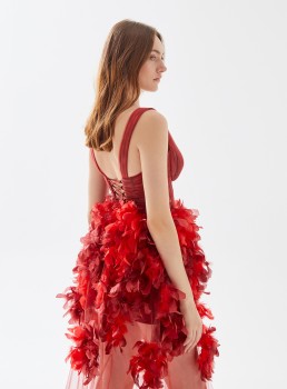 فستان مكسو بالرباط من اعلى الظهر مع تنورة قصيرة من الريش والتول يعرض بشكل حصري علي تيا دريس من فساتين طارق ايديز 2023