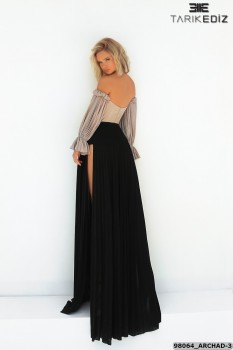 فستان طارق ايديز 2022 من كولكشن طارق ايديز الجديد باكمام طويلة وقصة اكتاف اوف شولدر بخامة تتمدد مدموج باللون الاسود والبيج يعرض بشكل حصري علي تيا دريس من كولكشن tarik ediz 22 – tarik ediz 98064