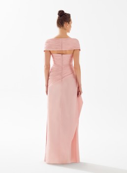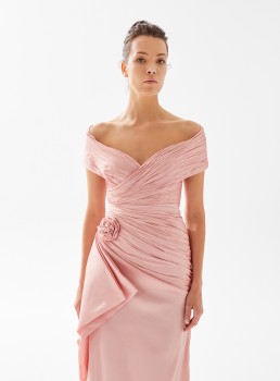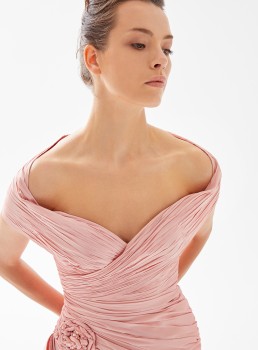 فستان مكشوف الأكتاف ومزين بالورود يعرض بشكل حصري علي تيا دريس من فساتين طارق ايديز 2023