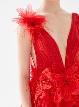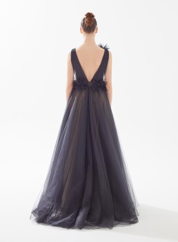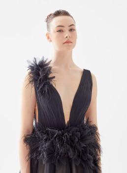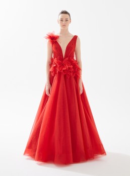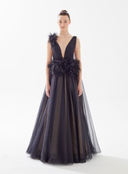 فستان طويل تول مزين بالريش يعرض بشكل حصري علي تيا دريس من فساتين طارق ايديز 2023