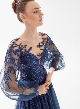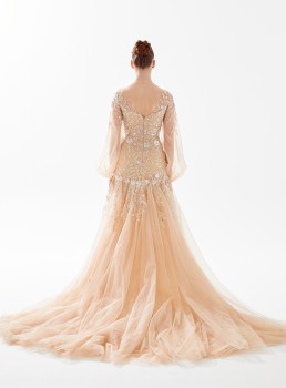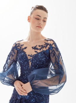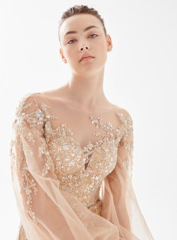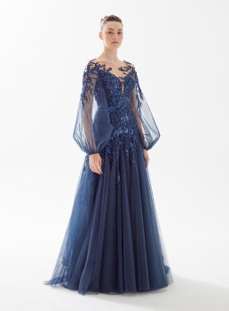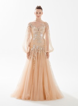 فستان من التول مزين برقبة شفافة وأكمام طويلة يعرض بشكل حصري علي تيا دريس من فساتين طارق ايديز 2023