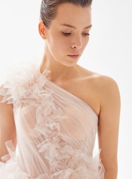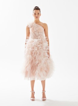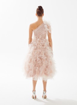 فستان متوسط الطول من التول بكتف واحد مع تنورة مكشكشة يعرض بشكل حصري علي تيا دريس من فساتين طارق ايديز 2023