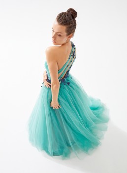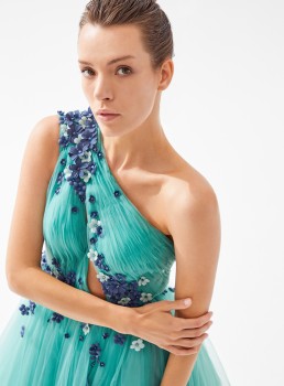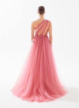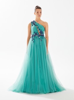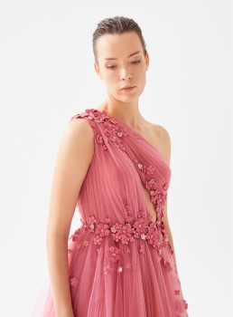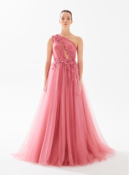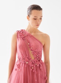 فستان بكتف واحد غير متماثل مع تزيين بالورود يعرض بشكل حصري علي تيا دريس من فساتين طارق ايديز 2023