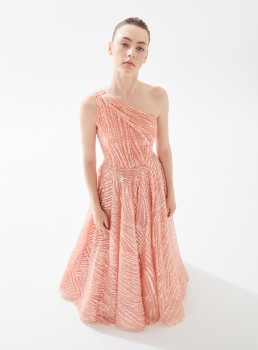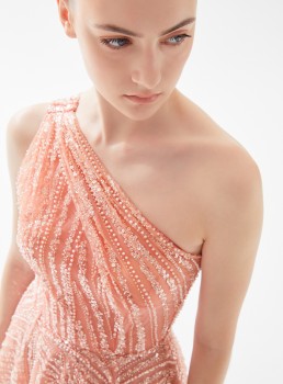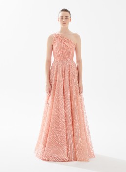 فستان بكتف واحد مطرز بالكريستال يعرض بشكل حصري علي تيا دريس من فساتين طارق ايديز 2023