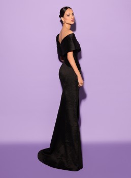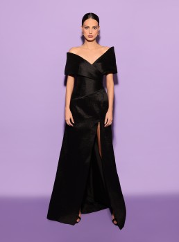 فستان أوف شولدر طويل ذات فتحة من الأمام مناسب للسهرات والمناسبات متوفر على تيا دريس ضمن أحدث كولكشن فساتين طارق إديز .