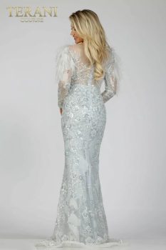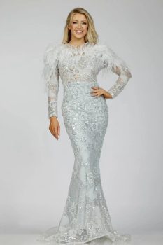 فستان بقصة ضيّقة وتطريز فاخر بالكامل، يزيّنه ريش ناعم عند الأكتاف لإطلالة ملكية جريئة تلفت الأنظار في مناسبتك.