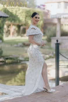 فستان أوق شولدر مطرز بفتحة متوسطة مناسب للسهرات والحفلات متوفر على تيا دريس.