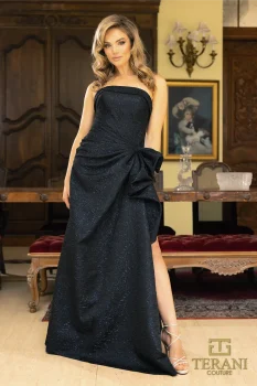 فستان سهرة مطرز بدون حمالات بتصميم راقي متوفر على تيا دريس.