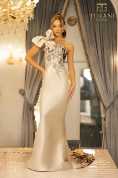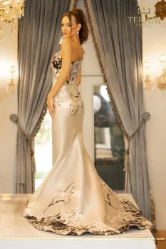 فستان سهرة بطباعة ميكادو بكتف واحد وتصميم مميز متوفر على تيا دريس.
