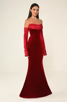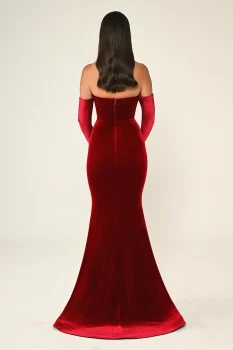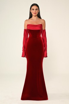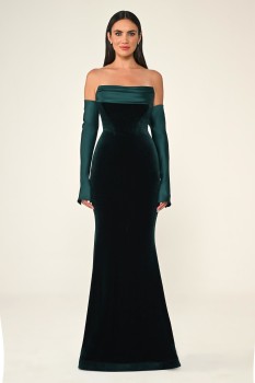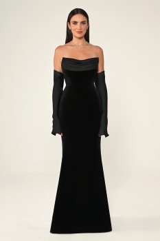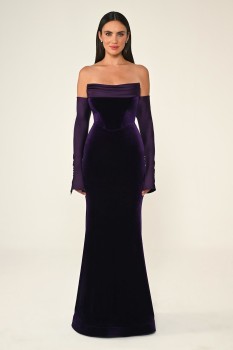 فستان طويل مخملي بأكمام بدون حمالات متوفر على تيا دريس.
