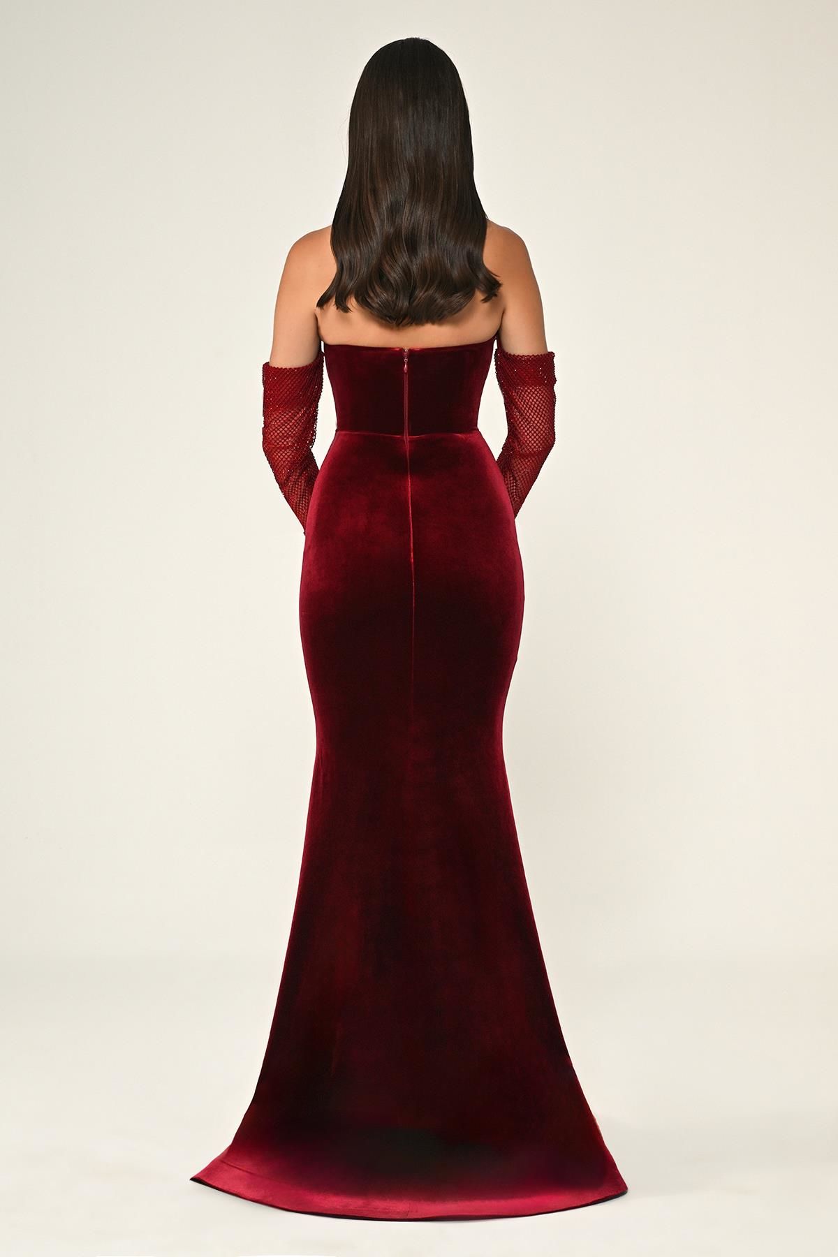 فستان طويل مخملي بأكمام شبكية مرصعة بحورية البحر متوفر على تيا دريس