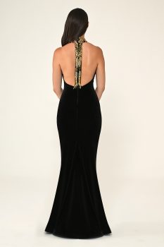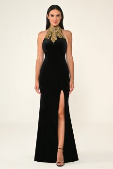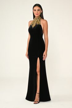 تألقي بفستان مخملي باللون الأسود مطرز بالكريستال وبتصميم مميز متوفر على تيا دريس.