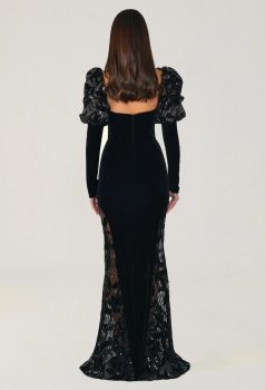 تنورة طويلة الأكمام الدانتيل الجانب فستان طويل المخمل
