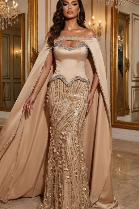 فستان من الستان والكورسيه مشغول بشكل فاخر بكب طويل مفتوح الي نصفين من الخلف مخصر