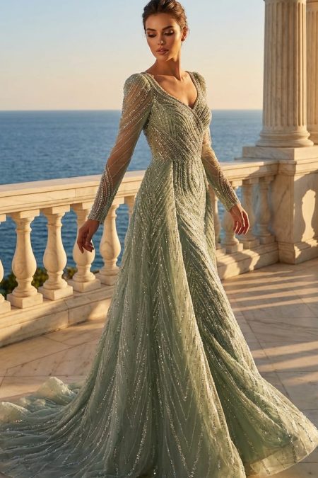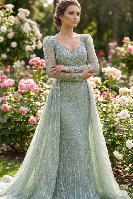 فستان باكمام طويلة بقطعة خلفية اضافية مشغول بشكل كامل
