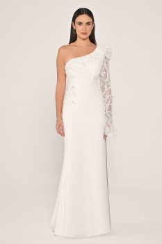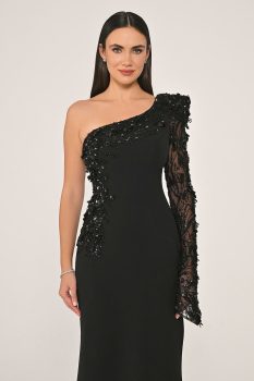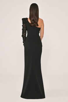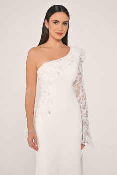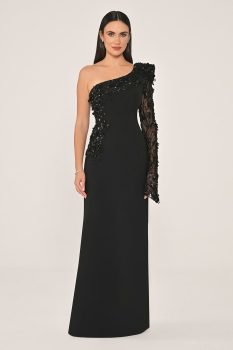 فستان طويل من الكريب مطرز بكم واحد وذات تصميم مميز من كولكشن ألفا بيتا الجديد.