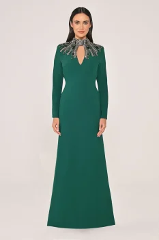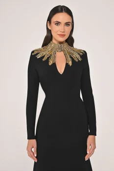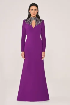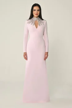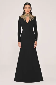 فستان طويل مصنوع من الكريب بإكسسوارات علوية وأكمام طويلة متوفر على تيا دريس.