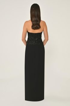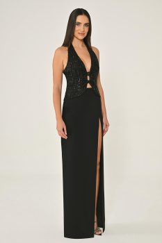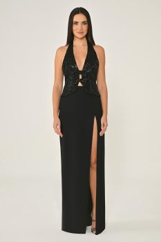 فستان سهرة طويل من الكريب مع تنورة مطرزة بالترتر ورقبة على شكل حرف v.