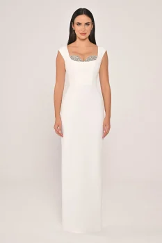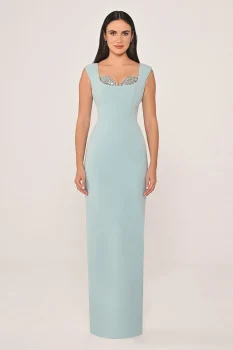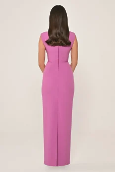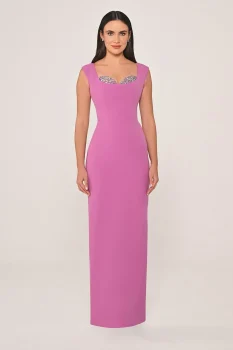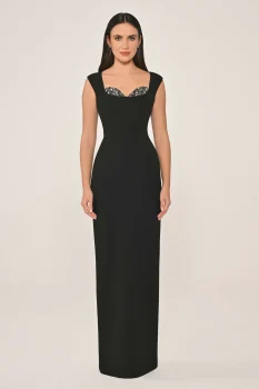 فستان طويل من الكريب بقصّة مميزة مع إكسسوارات على الصدر من مجموعة ألفابيتا لعام 2025.