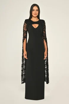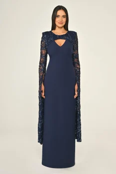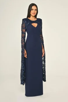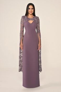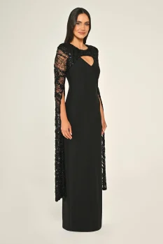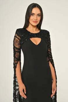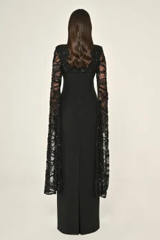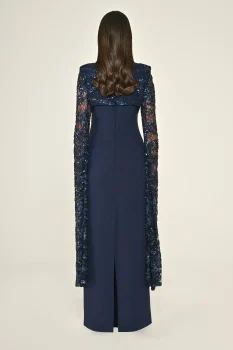 فستان طويل من قماش الكريب بأكمام مزينة بالترتر وعلى شكل شال متوفر الآن على تيا دريس.