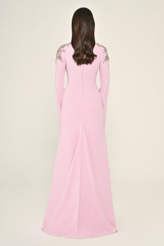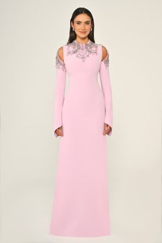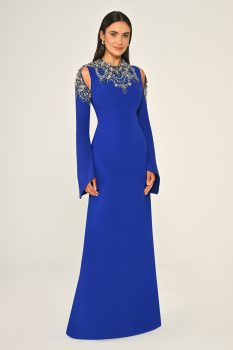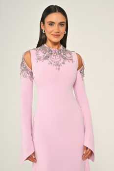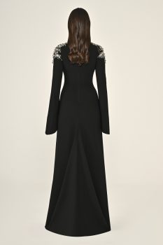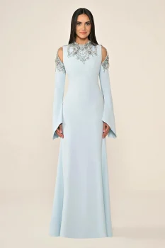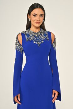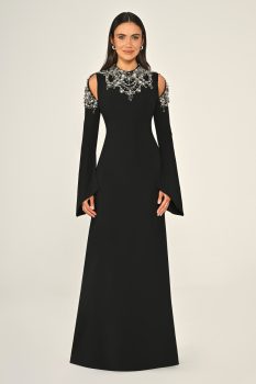 فستان كلاسيكي بتفاصيل تطريز فضية على الأكتاف والرقبة مع الأكمام الطويلة، مما يخلق إطلالة راقية ومميزة.