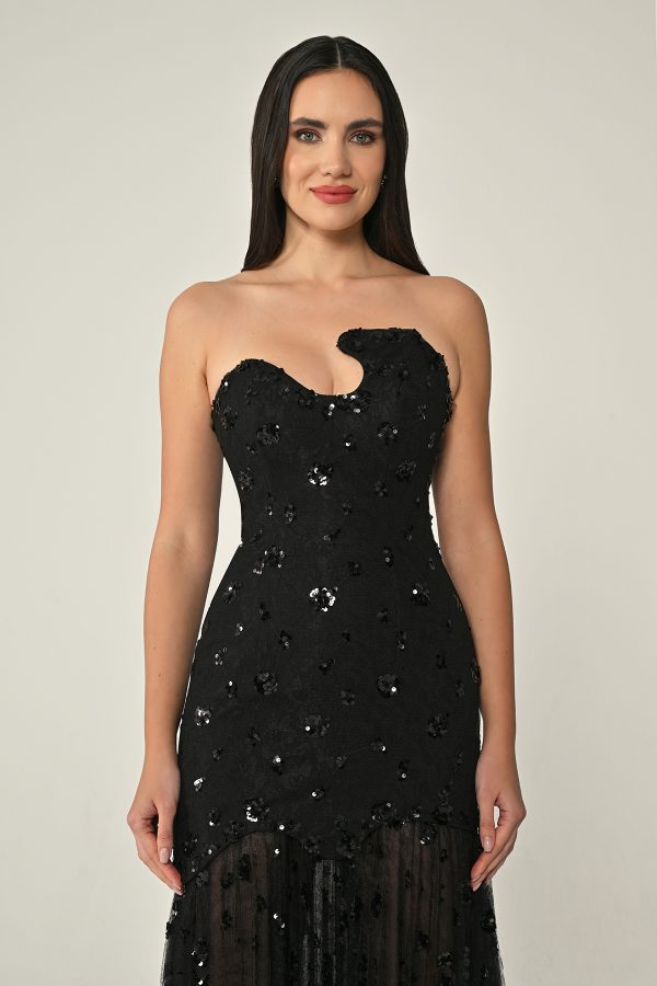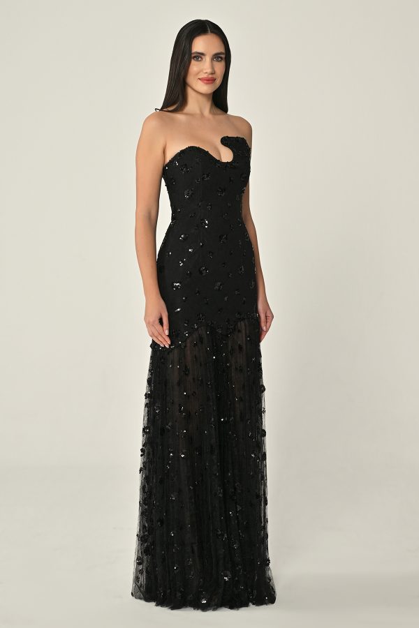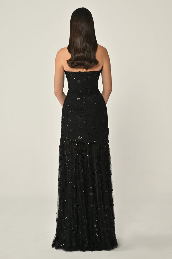 فستان توب بتفاصيل لامعة والتنورة الطويلة من التول تجعله مناسب للحفلات المتنوعة.