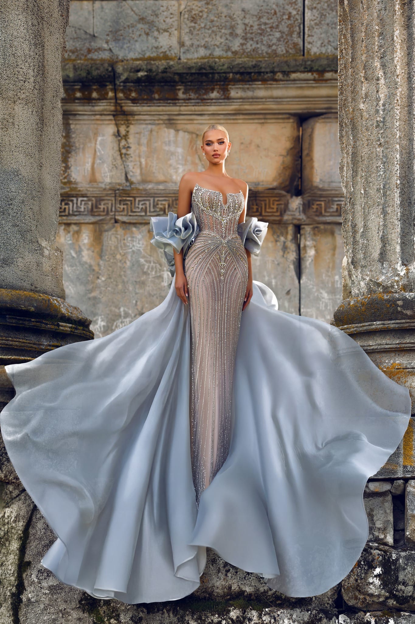 تصميم أنيق وفاخر بقصة طويلة، يتميز بجزء علوي بلا كتفين مزين بالتطريزات البلورية الفاخرة التي تعطي لمعانًا مميزًا. التنورة مصممة بأقمشة حريرية خفيفة بلون رمادي فاتح تتدفق بحرية، مع ذيل طويل يضيف دراما إلى الإطلالة. يحتوي الفستان أيضًا على تفاصيل رائعة مثل الأكمام المبطنة بأشكال الورود على الكتفين، مما يعزز من أناقته وأنوثته