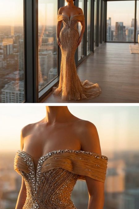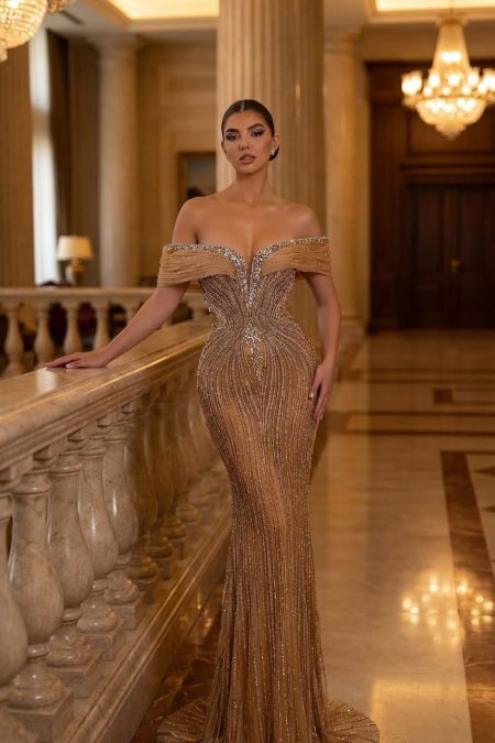 فستان من الفئة الملكية من مجموعة تيا كوتور مشغول بالكامل بقصة صدر اوف شولدر