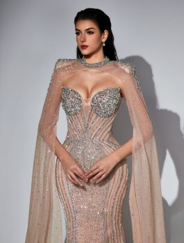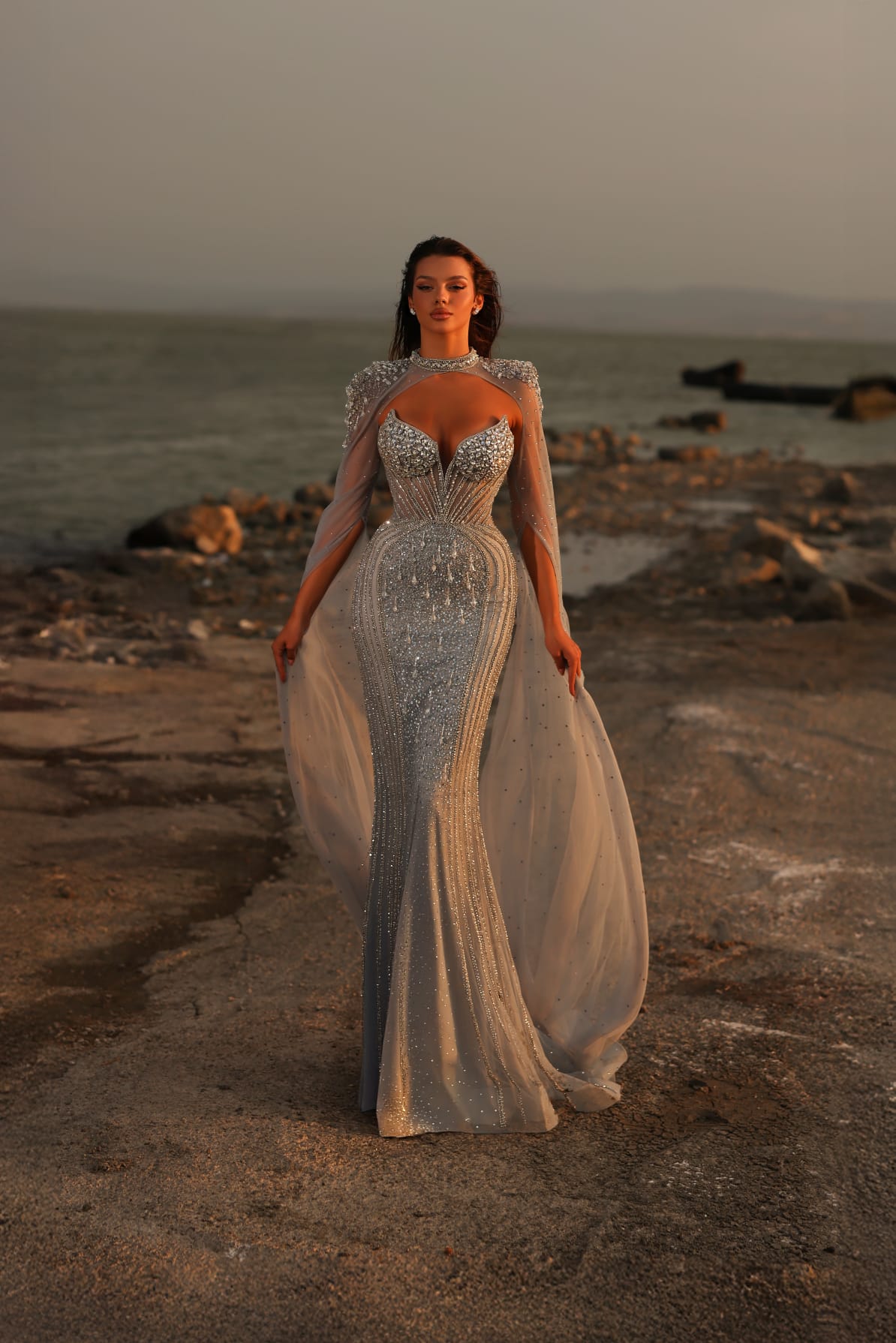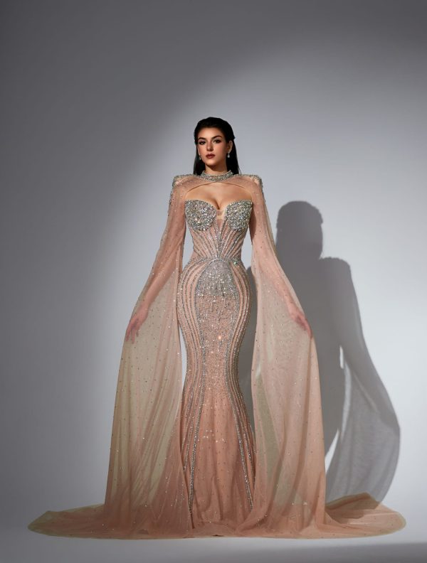 فستان مشغول بشكل كامل باكمام طويلة علي الاكتاف مشغول بالكرستال بالاحجار