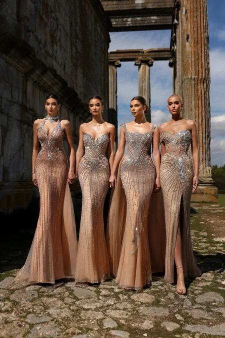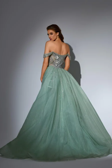 فستان اوف شولدر مشغول بالكرستال والخرز بقطعة اضافية بالخلف بالوان ساحرة من الكولكشن الجديد