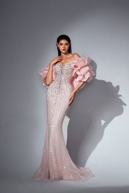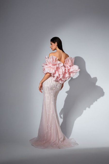 فستان من الفئة الخاصة ذات الانتاج المحدود مشغول بشكل كامل مع قطعة خلفية تلبس علي الاكمام مرصع بالاحجار والكرستال